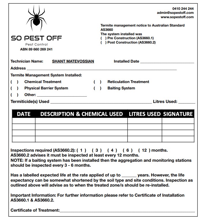 - A certificate outlining the details of the installed termite management system